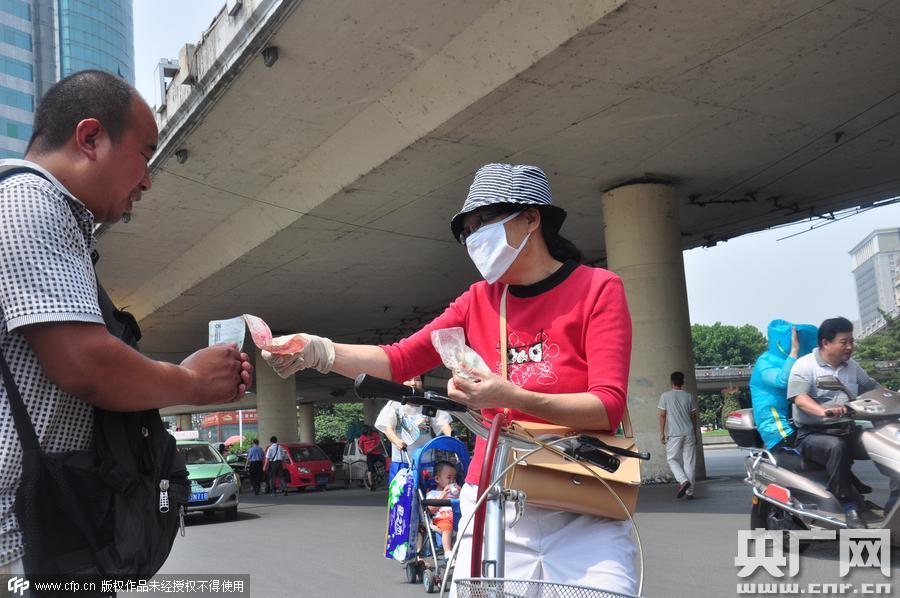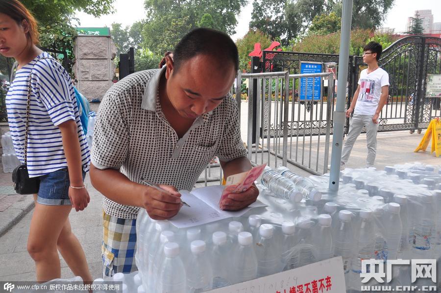2015年8月23日,河南鄭州,“賣水爸爸”李俊強(qiáng)街頭籌善款給女兒治病。 市民捐款
