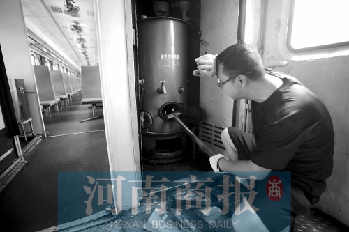 7月28日,新鄉(xiāng)最高氣溫36℃。下午1點30分,河南商報記者進入車廂,車廂內(nèi)溫度計顯示44℃。這個時候,供水員李波和王旭陽,已經(jīng)在車上工作了1個多小時。當河南商報記者走近茶爐時,甚至能感覺到毛孔在一瞬間“炸開”。作為上車最早的茶爐工,他們中午12點就要上車,找劈柴、點火、燒水,將每個硬座車廂的保溫桶和全車66個暖瓶灌滿。2014年綠皮車相繼淘汰,自此再沒專人提供用于燃煤茶爐點火的劈柴,全靠供水工自己找尋。