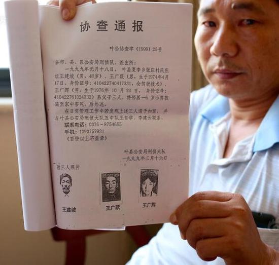 8月21日,河南平頂山,遇害兒童王龍龍的父親王偉,向記者展示當年葉縣警方發(fā)布的協(xié)查通報。從29歲追到47歲,王偉不僅要替兒守尸,還要漫無目的地追兇,任何線索也沒發(fā)現(xiàn)。當初被警方通緝的4個嫌疑人,有3人已回鄉(xiāng)多年,因證據(jù)不足,他們已恢復自由。