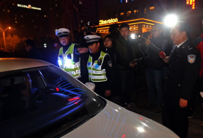 ▲11月16日晚,河南省公安廳交警總隊總隊長馮國文(右一)帶隊查酒駕。