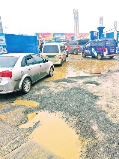 鄭州農(nóng)業(yè)路與沙口路附近的保通路上,交叉口東西兩側(cè)各有一處較大的深坑。西側(cè)一處深約20厘米,不少電動車主行至坑邊,不敢涉水通過,只能擠進快車道行駛,非常危險;東側(cè)一處大坑面積約60平方米,水坑最深處可達30厘米,私家車從此經(jīng)過,濺起一片水花。該大坑正處一個丁字路口正中央,且沙口路、農(nóng)業(yè)路的車輛僅有此處一條通道,因車輛通行緩慢,路面私家車排起一條長龍。