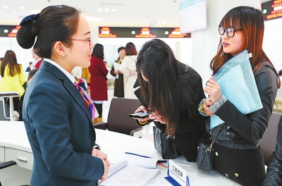 4月1日,中國(河南)自由貿(mào)易試驗(yàn)區(qū)鄭州片區(qū)綜合服務(wù)中心內(nèi),工商預(yù)審柜臺(tái)正在接受客戶咨詢。⑨7本報(bào)記者聶冬晗攝