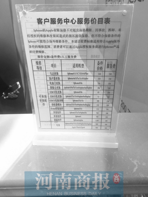 價(jià)目表顯示,維修項(xiàng)目有11項(xiàng),價(jià)格與正規(guī)蘋果售后基本一致。
