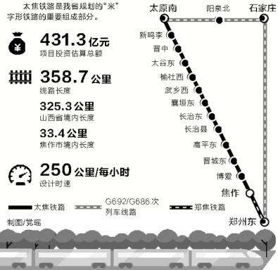 太焦鐵路是我省規(guī)劃的“米”字形鐵路的重要組成部分,項(xiàng)目投資估算總額為431.3億元,線路長(zhǎng)度358.7公里,其中山西省境內(nèi)325.3公里,我省焦作市境內(nèi)33.4公里。工程計(jì)劃建設(shè)周期為5年,設(shè)計(jì)時(shí)速為每小時(shí)250公里。全線設(shè)太原南、新鳴李、晉中、太谷東、榆社西、武鄉(xiāng)西、襄垣東、長(zhǎng)治東、長(zhǎng)治縣、高平東、晉城東、博愛(ài)及焦作13個(gè)車站。