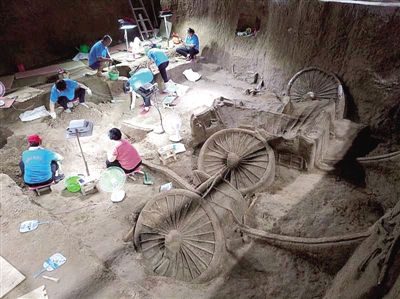 記者在現(xiàn)場看到,盡管在地下埋了2400多年,但經(jīng)過考古人員的清理,兩輛車的模樣已經(jīng)呈現(xiàn)在大家面前:兩輛車南北并排,車頭向西,車衡、車轅、車輿(車廂)、車輪清晰可辨。而在兩輛車車衡的下方,一匹馬的頭骨也已出現(xiàn)。在南側(cè)已經(jīng)出土的馬車旁,車輿頂部出現(xiàn)了幾根類似筷子模樣的東西,專家介紹說,這應(yīng)該是青銅材質(zhì)的飾件。古代的安車車輿上面都有頂,而這些青銅飾件,主要就是用來固定車頂?shù)摹?/p>