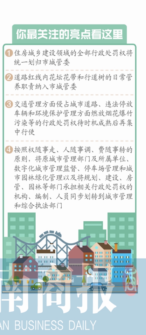 按照權隨事走、人隨事調、費隨事轉的原則,將原城市管理部門及所屬單位、數字化城市管理監(jiān)督、停車場管理和城市園林綠化管理涉及的機構、編制、人員同步劃轉到城市管理和綜合執(zhí)法部門;將規(guī)劃、建設、房管、園林等部門承擔相關行政處罰權的機構、編制、人員同步劃轉到城市管理和綜合執(zhí)法部門。