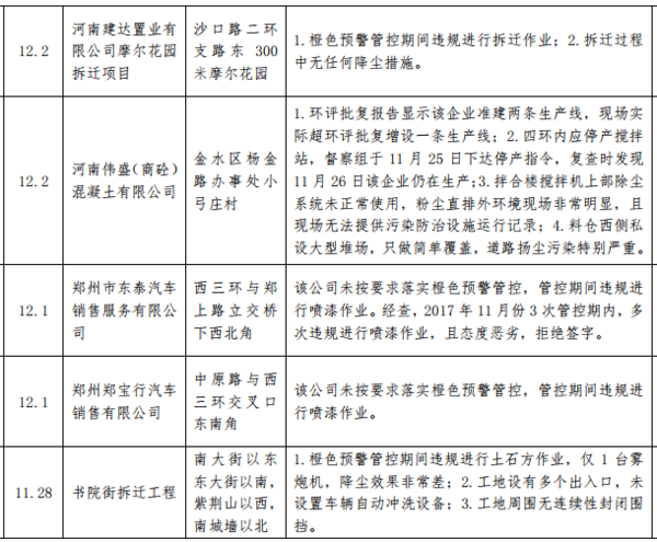 12月7日,記者從鄭州市環(huán)境污染防治攻堅(jiān)辦了解到,11月27日至12月3日,鄭州市環(huán)境污染防治督導(dǎo)組重點(diǎn)對(duì)全市"封土行動(dòng)"方案、橙色預(yù)警管控措施落實(shí)和30天沖刺行動(dòng)方案落實(shí)情況進(jìn)行督導(dǎo)檢查。從督查情況來看,大部分單位都?jí)虬凑找?,落?shí)"封土令"和預(yù)警管控措施,但也有個(gè)別施工工地和企業(yè)未按要求停工、停產(chǎn)或限產(chǎn)減排。