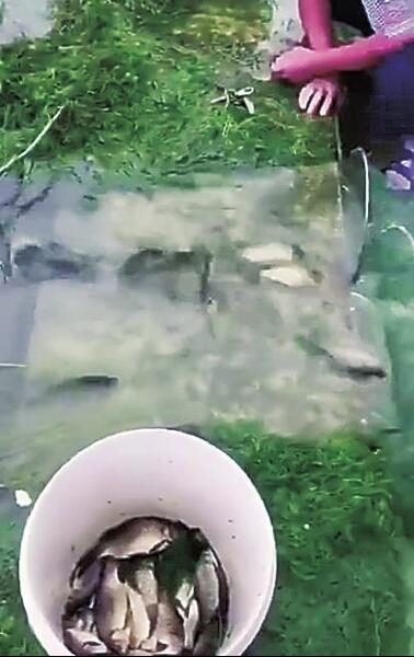 本次強(qiáng)降雨還導(dǎo)致固始縣境內(nèi)的多條河流水位暴漲,河邊地勢(shì)較低的農(nóng)田被淹沒。在固始縣城郊,一口水塘因?yàn)樗槐q,水從塘埂一處低洼處溢出,水塘內(nèi)大量鯽魚紛紛隨著水流準(zhǔn)備出逃。村民發(fā)現(xiàn)后,在水流下方用網(wǎng)攔住魚兒去路,不一會(huì)兒就收獲一水桶鯽魚。