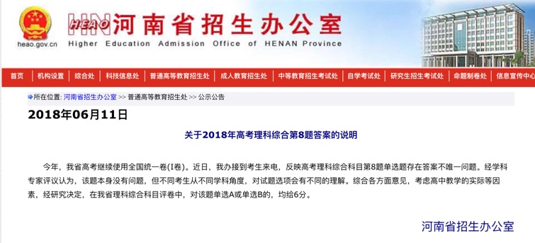 近日,河南省招生辦公室接到考生來電,反映高考理科綜合科目第8題單選題存在答案不唯一問題。經學科專家評議認為,該題本身沒有問題,但不同考生從不同學科角度,對試題選項會有不同的理解。