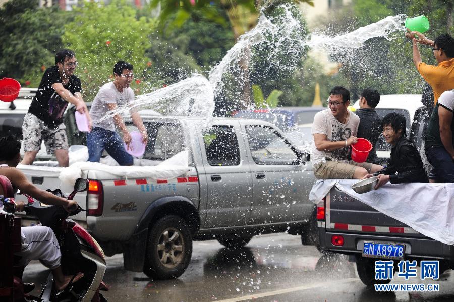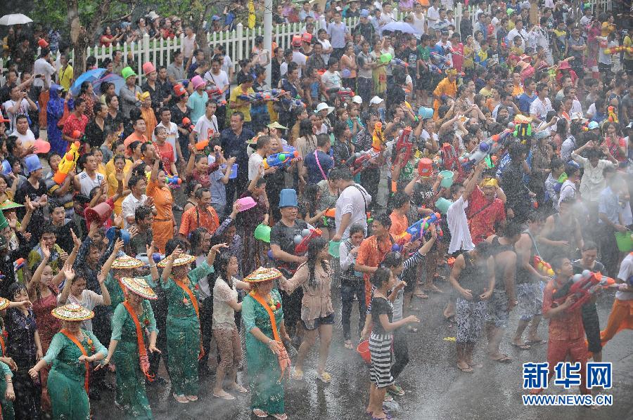 4月12日,各族群眾和游客在德宏芒市廣場上體驗潑水狂歡。當日,云南省德宏傣族景頗族自治州繼續(xù)舉行2013年國際潑水狂歡節(jié),各族群眾和游客歡聚在德宏芒市廣場狂歡潑水,祈福吉祥平安。 新華社記者秦朗 攝