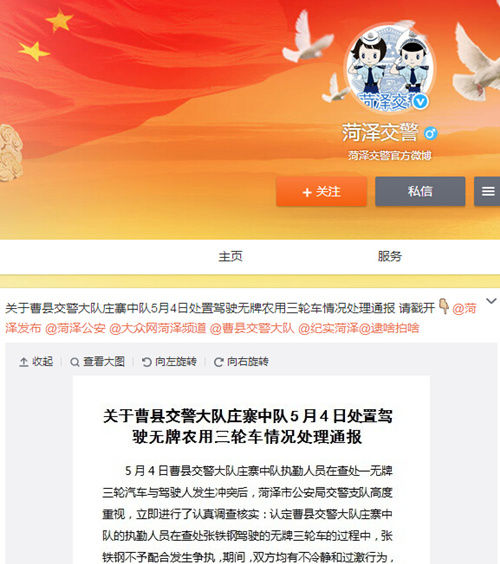 針對此事,菏澤交警表示,5月4日曹縣交警大隊莊寨中隊執(zhí)勤人員在查處一無牌三輪汽車與駕駛?cè)税l(fā)生沖突后,菏澤市公安局交警支隊高度重視,立即進行了認真調(diào)查核實。調(diào)查認定,曹縣交警大隊莊寨中隊執(zhí)勤人員在查處張鐵鋼駕駛的無牌三輪車的過程中,由于張鐵鋼不予配合發(fā)生爭執(zhí),爭執(zhí)期間雙方均有不冷靜和過激行為,并發(fā)生肢體沖突,在社會上造成了不良影響。決定對曹縣交警大隊分管中隊的負責(zé)人石保安警誡一次、通報批評;給予曹縣交警大隊莊寨中隊中隊長黃鳳春行政警告處分,予以免職;給予涉事協(xié)警辭退處理。