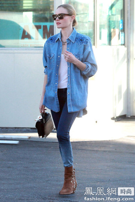 這一套造型讓牛仔成為主導(dǎo),Oversize的男孩式牛仔襯衫外套最能凸顯帥氣的Boy風(fēng)格,而和牛仔藍(lán)色最百搭的棕色系點(diǎn)綴其中,瘦腿的牛仔褲和上身形成強(qiáng)烈視覺對比,哪怕是披發(fā),也照樣酷勁十足!