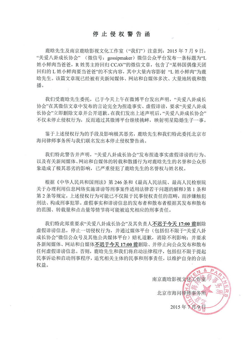 7月9日,關(guān)于“關(guān)愛(ài)八卦成長(zhǎng)協(xié)會(huì)”微信公眾號(hào)發(fā)布“L姓小鮮肉當(dāng)爸爸”一文,影射鹿晗先生一事,鹿晗工作室發(fā)律師函否認(rèn)并警告其造謠生事,稱:“我們受鹿晗先生委托,已于今天上午在微博平臺(tái)發(fā)出聲明,“關(guān)愛(ài)八卦成長(zhǎng)協(xié)會(huì)”在其微信文章中發(fā)布的言論完全為捏造誹謗,要求‘關(guān)愛(ài)八卦成長(zhǎng)協(xié)會(huì)’立即刪除文章并公開(kāi)道歉。在我們發(fā)出上述聲明后,‘關(guān)愛(ài)八卦成長(zhǎng)協(xié)會(huì)’不僅未停止侵權(quán)行為,反而通過(guò)其微博平臺(tái)繼續(xù)挑釁,映射明星隱婚生子一事,鑒于行為惡劣,發(fā)出警告函。”