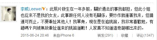 6月24日晚,李威發(fā)布微博回應(yīng)“照片門”,表示“此照片發(fā)生在一年多前,關(guān)于過(guò)去的事我都擔(dān),但此小姐也從來(lái)不是我的女友,此事跟任何人沒(méi)有毛關(guān)系,要炒作就沖著我來(lái),但請(qǐng)適可而止,不要牽扯其他人!我單身,現(xiàn)在是在追姚笛,我非常喜歡她,有錯(cuò)嗎?向被無(wú)故牽扯進(jìn)來(lái)的姚笛道歉!人家真不知道這奇葩哪出來(lái)的?!?/font>
