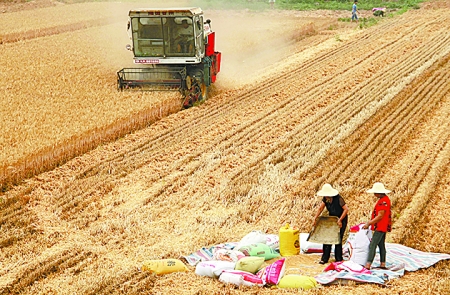 6月9日,收割機(jī)在武陟縣龍泉辦事處郭堤村作業(yè)。目前,武陟縣已收獲小麥43萬(wàn)畝,收獲面積過(guò)半。馮小敏 攝