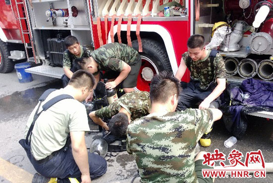 由于天氣炎熱,加上接近火災現(xiàn)場、救援時間長,多名消防戰(zhàn)士虛脫暈倒,現(xiàn)場注射和飲用生理鹽水,附近商戶也為消防戰(zhàn)士送來飲用水。