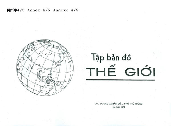 1972年5月越南總理府測量和繪圖局印制的《世界地圖集》,用中國名稱標注西沙群島(見附件4)。1974年越南教育出版社出版的普通學校九年級《地理》教科書,在《中華人民共和國》一課(見附件5)中寫道:“從南沙、西沙各島到海南島、臺灣島、澎湖列島、舟山群島,……這些島呈弓形狀,構成了保衛(wèi)中國大陸的一座‘長城’?!?/p>
