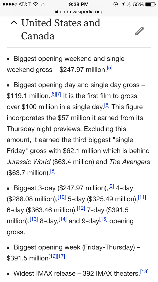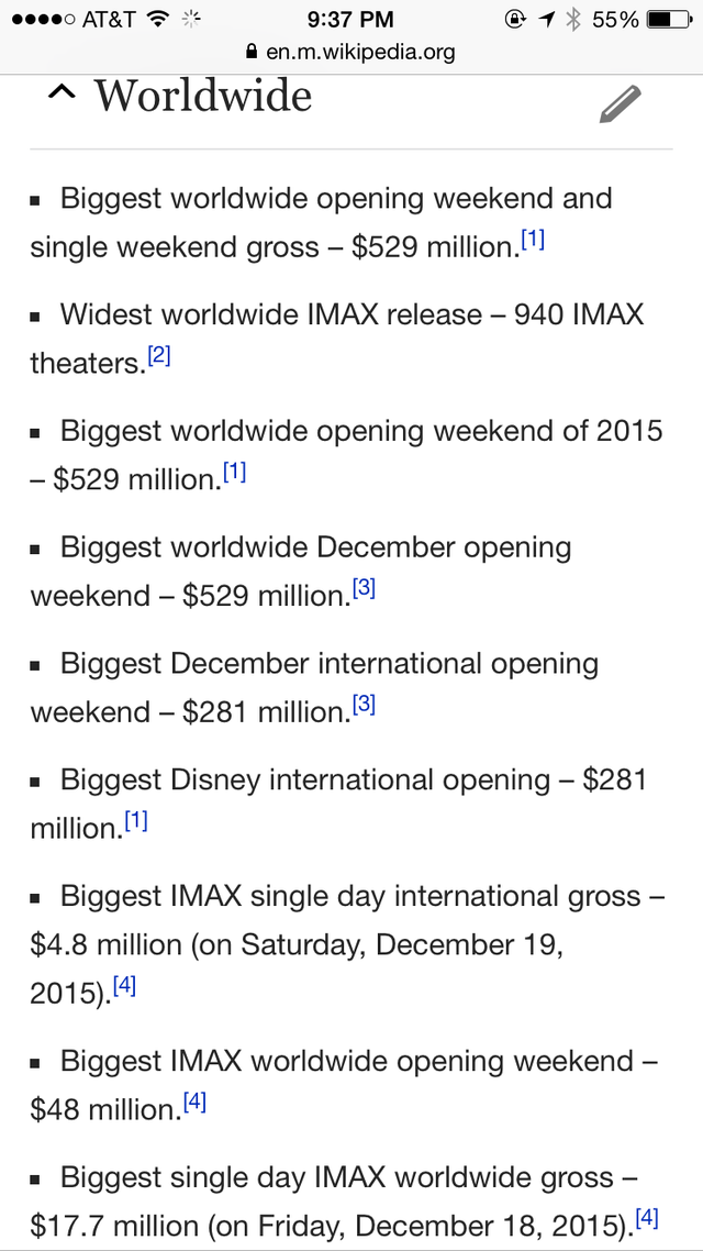 截圖只占該詞條的五分之一都不到哦,這齊刷刷的一片 Biggest/ Widest 真是氣壯山河??!預(yù)計到本周末《星戰(zhàn)7》將在北美拿下5億票房,比前任紀(jì)錄保持者《侏羅紀(jì)世界》快了近整整一倍之多!”票房記錄粉碎機(jī)“之稱果然名副其實!
