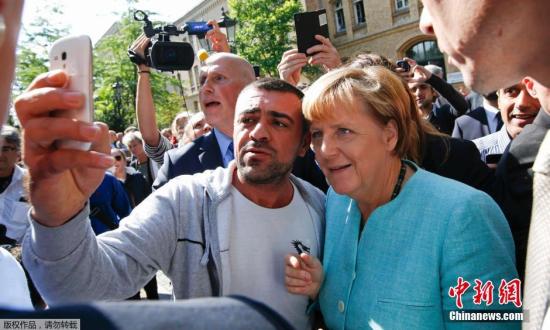 資料圖:柏林的一處難民營外,一位移民拿起手機與默克爾自拍合影。