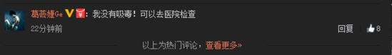 微博發(fā)出后,有網(wǎng)友問葛薈婕是否吸毒了,葛薈婕評論中回復(fù)“我沒有吸毒!可以去醫(yī)院檢查”。
