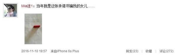 11月10日晚,張靚穎媽媽通過微博曝馮柯前妻魏蕾的離婚承諾書,魏蕾承諾在2006年1月內(nèi)在律師的監(jiān)督下與馮軻辦理離婚手續(xù),條件是馮柯承擔(dān)其女兒馮亞孟至中學(xué)比亞的所有學(xué)習(xí)費用,承諾書簽訂時間為2005年12月30日。