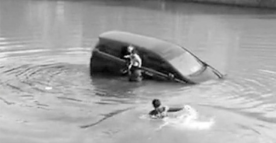 哪知,女司機大概嚇壞了,一下就沉下水去,郭剛馬上托她胳膊,助她浮起來。河水深2米多,郭剛連拖帶拽將她弄到岸邊。