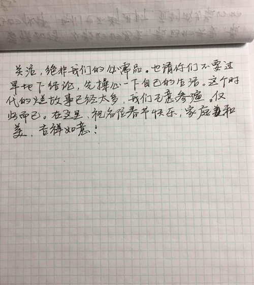 網(wǎng)易娛樂1月26日?qǐng)?bào)道 日前,演員周立波在美國長島因涉嫌持有槍支、藏有毒品而被美國警方逮捕,在繳納保釋金后獲得保釋。此前周立波先是在美國通過媒體表示“持有的槍支合法,毒品并非其所有。之后還曾發(fā)微博自證“事實(shí)和法律將還我清白”。而就在1月26日早上,周立波妻子胡潔通過微博發(fā)布自己的一封手寫信,力贊丈夫周立波“完美”。對(duì)于近日的是非,她更表示“請(qǐng)不要過早下結(jié)論,先操心自己的生活”。