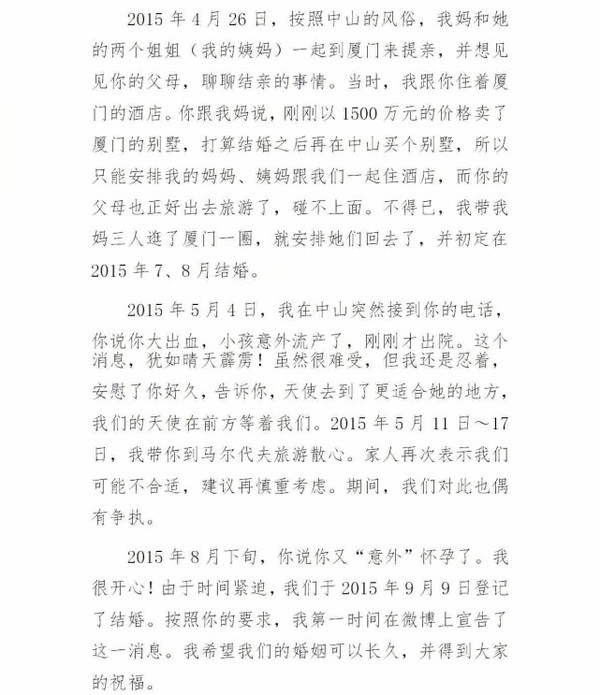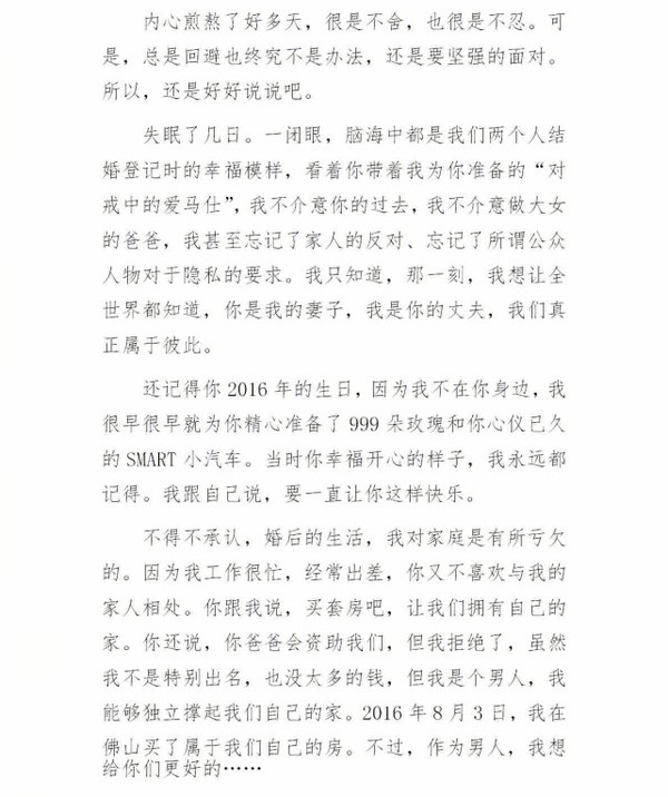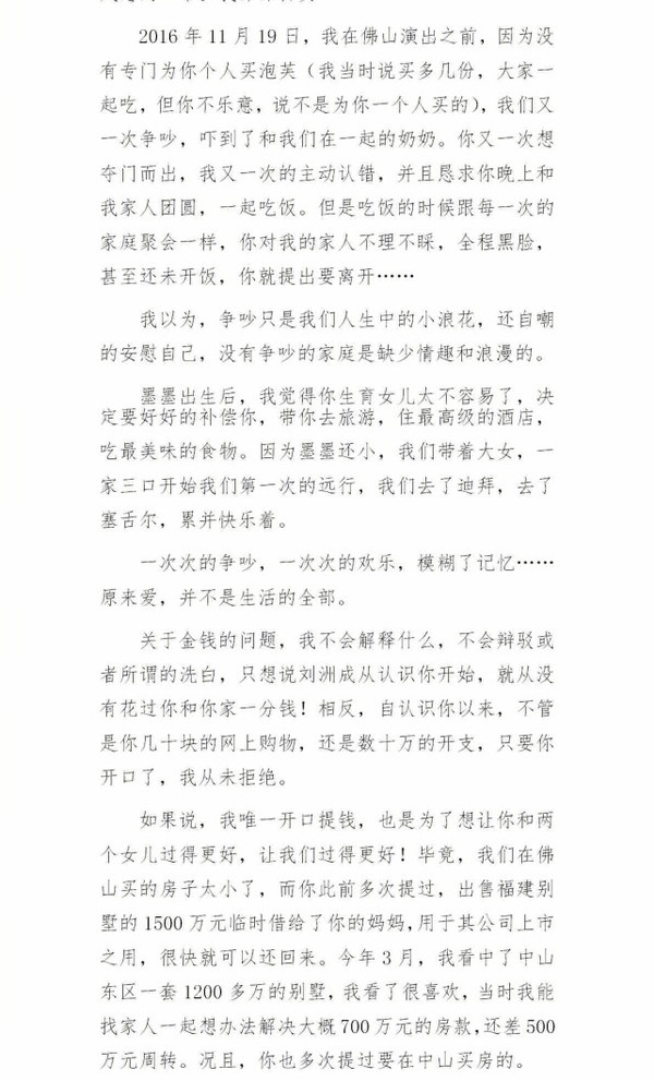 搜狐娛樂訊 5月23日凌晨,劉洲成發(fā)微博回應(yīng)家暴致前妻林苗流產(chǎn)及要求前妻出錢買房等傳聞。劉洲成在文中以時(shí)間為緯度講述他與前妻相識(shí)相愛到結(jié)婚的過程,還列舉出前妻從懷孕到流產(chǎn)的事例,劉洲成在文中還稱“從認(rèn)識(shí)你開始,就從沒花過你和你家一分錢”。此外,劉洲成更是曬出了昔日的聊天記錄、代付清單、借記卡賬戶歷史明細(xì)清單等證據(jù),疑似反駁前妻所述不實(shí)。