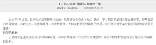據(jù)中國經(jīng)濟網(wǎng)記者了解,今年3月15日,歐洲化學品管理局(ECHA)風險評估委員會(RAC)也正式確認了確認草甘膦為非致癌物。