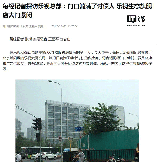 樂視最近可謂麻煩不斷,在確認(rèn)賈躍亭99.06%持股被凍結(jié)后,據(jù)每日經(jīng)濟(jì)新聞報(bào)道,位于北京朝陽區(qū)的樂視大廈門口躺滿了前來討債的供應(yīng)商。