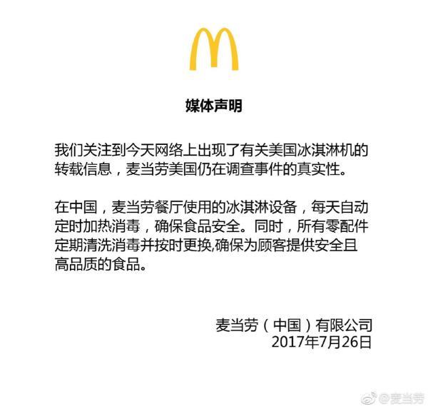 7月26日23時許,麥當(dāng)勞官方微博發(fā)布了《關(guān)于美國冰淇淋機(jī)的媒體聲明》:“我們關(guān)注到今天網(wǎng)絡(luò)上出現(xiàn)了有關(guān)美國冰淇淋機(jī)的轉(zhuǎn)載信息,麥當(dāng)勞美國仍在調(diào)查事件的真實性。在中國,麥當(dāng)勞餐廳使用的冰淇淋設(shè)備,每天自動定時加熱消毒,確保食品安全。同時,所有零配件定期清洗消毒并按時更換,確保為顧客提供安全且高品質(zhì)的食品?!?/p>