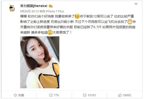 8月20,雪莉在小號微博@“菲力姐姐jfiensksl ”公布懷孕:“嘿嘿,和你們說個(gè)好消息,我要做媽媽了,終于熬到12周可以說了,吐的比較嚴(yán)重,影響了之前上新進(jìn)度,月底也只能小新,不過下個(gè)月我就可以坐飛機(jī)出去拍了。會盡量給你們保質(zhì)保量帶來好看的衣服,目前已經(jīng)胖了6.7斤,如果照片視頻里的我越來越胖,請多多包涵,太容易餓了! ”