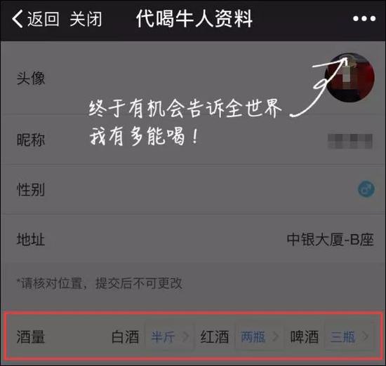 用戶(hù)在軟件中輸入或設(shè)置自己的位置,手機(jī)畫(huà)面的地圖上就會(huì)顯示出附近的 “代喝人”。這些“代喝人”在提供“代喝”服務(wù)之前,會(huì)提前在軟件上的個(gè)人信息中寫(xiě)明自己的酒量、喜歡的酒類(lèi)以及性別等基本信息。無(wú)論是誰(shuí)都可以成為代喝人。