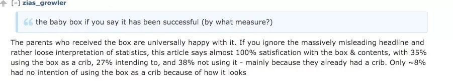 有網(wǎng)友說,“許多收到盒子的父母都很滿意,盒子里的東西可以給小寶寶用,而盒子本身還可以當成一個嬰兒床?!?/p>