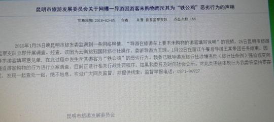 近日,網(wǎng)傳云南一導(dǎo)游斥未購(gòu)物游客為“鐵公雞”,引發(fā)關(guān)注。昆明市旅發(fā)委稱,2018年1月25日晚昆明市旅發(fā)委監(jiān)測(cè)到一條網(wǎng)絡(luò)輿情,“導(dǎo)游在旅游車上要求未購(gòu)物的游客填寫(xiě)說(shuō)明”的視頻,26日昆明市旅游監(jiān)察支隊(duì)立即開(kāi)展調(diào)查。