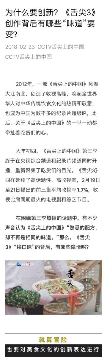 《舌尖上的中國》官方轉(zhuǎn)發(fā)某媒體長文回應(yīng)第三季質(zhì)量不佳的質(zhì)疑:就算冒險,也要對美食文化的創(chuàng)新表達(dá)進(jìn)行探索。
