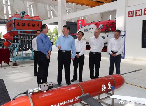 【習近平視察中科院深??茖W與工程研究所】12日下午,習近平總書記來到位于海南三亞的中國科學院深??茖W與工程研究所,仔細察看“海翼”號深?;铏C、“天涯”深淵著陸器等設備,并同“深海勇士”號載人潛水器設計師和深潛團隊親切交談。
