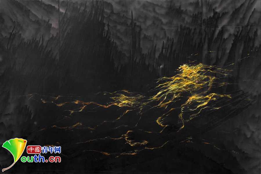 金線用蘇繡典型的平針繡法繡在真絲底料上,明暗金黃色從近處向遠處延伸,燈光照射下,一如夜空中的萬家燈火。若有燈光照射,參觀者會發(fā)現(xiàn)整個底料上還暗藏一幅潑墨山水畫。