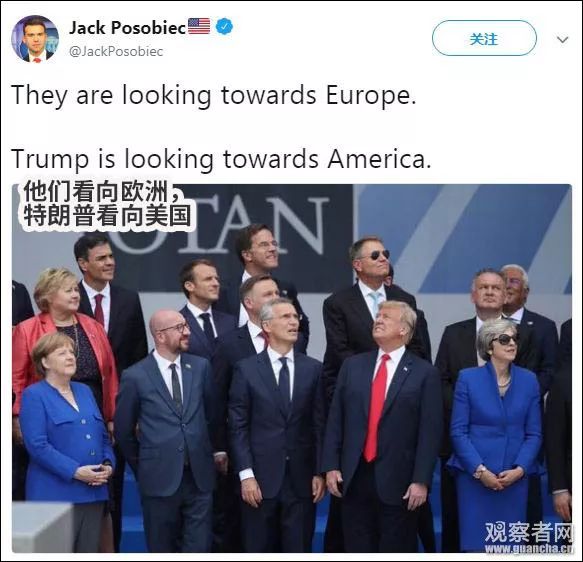 而這張神奇的照片里,幾乎所有人,包括法國(guó)總統(tǒng)馬克龍、德國(guó)總理默克爾、英國(guó)首相特蕾莎·梅這些“老朋友”,都看向自己的左邊,而特朗普則執(zhí)著地望向右邊的天空。