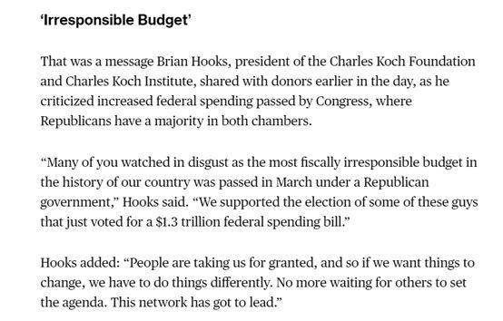 另外,科赫兄弟還表示他們不會(huì)再向以前那樣輕易支持共和黨的議員了,因?yàn)檫@些議員并沒(méi)有履行他們競(jìng)選時(shí)的承諾,反而是一直在支持美國(guó)政府的一些違背市場(chǎng)的政策,比如在今年3月的一項(xiàng)加大政府財(cái)政開(kāi)支的法案。
