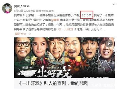 上映4天,黃渤導演的處女作《一出好戲》票房破6億。然而,8月12日晚,一位名叫于夢媛的編劇在微博發(fā)文稱,黃渤的《一出好戲》涉嫌抄襲她2013年寫的劇本《男人危機》。她在文中說道:“2013年,我寫了一個劇本并以一家影視公司的名義邀請黃渤出演劇中男一號,黃渤以故事框架與人物類型都不太適合為由拒絕了;但是,今天他卻用雷同的故事框架與人物類型自編自導自演了他作為導演的首部電影《一出好戲》!”新京報第一時間聯(lián)系了黃渤導演以及編劇于夢媛,兩人均未做出回應;隨后又聯(lián)系了當時參與《男人危機》籌備工作的工作人員張進(化名),還原了當時的一些事情經(jīng)過。