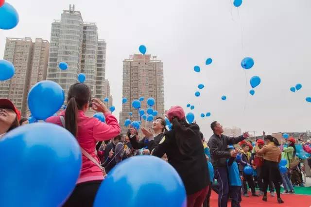 除了有藍(lán)色的氣球外,每個(gè)參與活動(dòng)的人都穿著藍(lán)色的服裝,頭戴藍(lán)色帽子,手系藍(lán)色絲帶,整個(gè)活動(dòng)現(xiàn)場(chǎng)成了一片藍(lán)色的海洋。