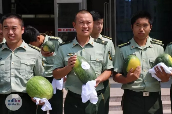 我們給他們每人都送了一個(gè)西瓜,遞到他們手里跟他們說(shuō):“你們辛苦了!”的時(shí)候,我們明顯能夠感覺(jué)到他們的喜悅,他們飽經(jīng)風(fēng)霜的臉上洋溢的笑容,讓人覺(jué)得特別溫馨、真誠(chéng)。