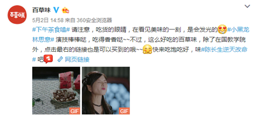 電視劇里收獲滿滿焦點,宣傳上,也要給力才行。在廣大觀眾們忙著截圖曬圈時,百草味的官方微博也沒閑著。電視劇播到哪,小編的截圖就跟到哪。緊跟劇情的同時附上店鋪鏈接,讓流量順利轉化為銷量。