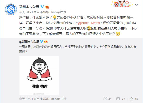 眾多網(wǎng)民發(fā)現(xiàn)不能玩雪,于是組隊(duì)去玩“鄭州市氣象局”了。在“鄭州市氣象局”的新浪微博上,網(wǎng)友有的調(diào)侃,有的逼問,把氣象局的小編已經(jīng)“逼瘋”。目前,該小編已經(jīng)開始在微博上暴走,每小時更新一次微博,并且和每位回復(fù)的粉絲“較真”的討論起這讓人瘋狂的“暴雪”為什么還不來。