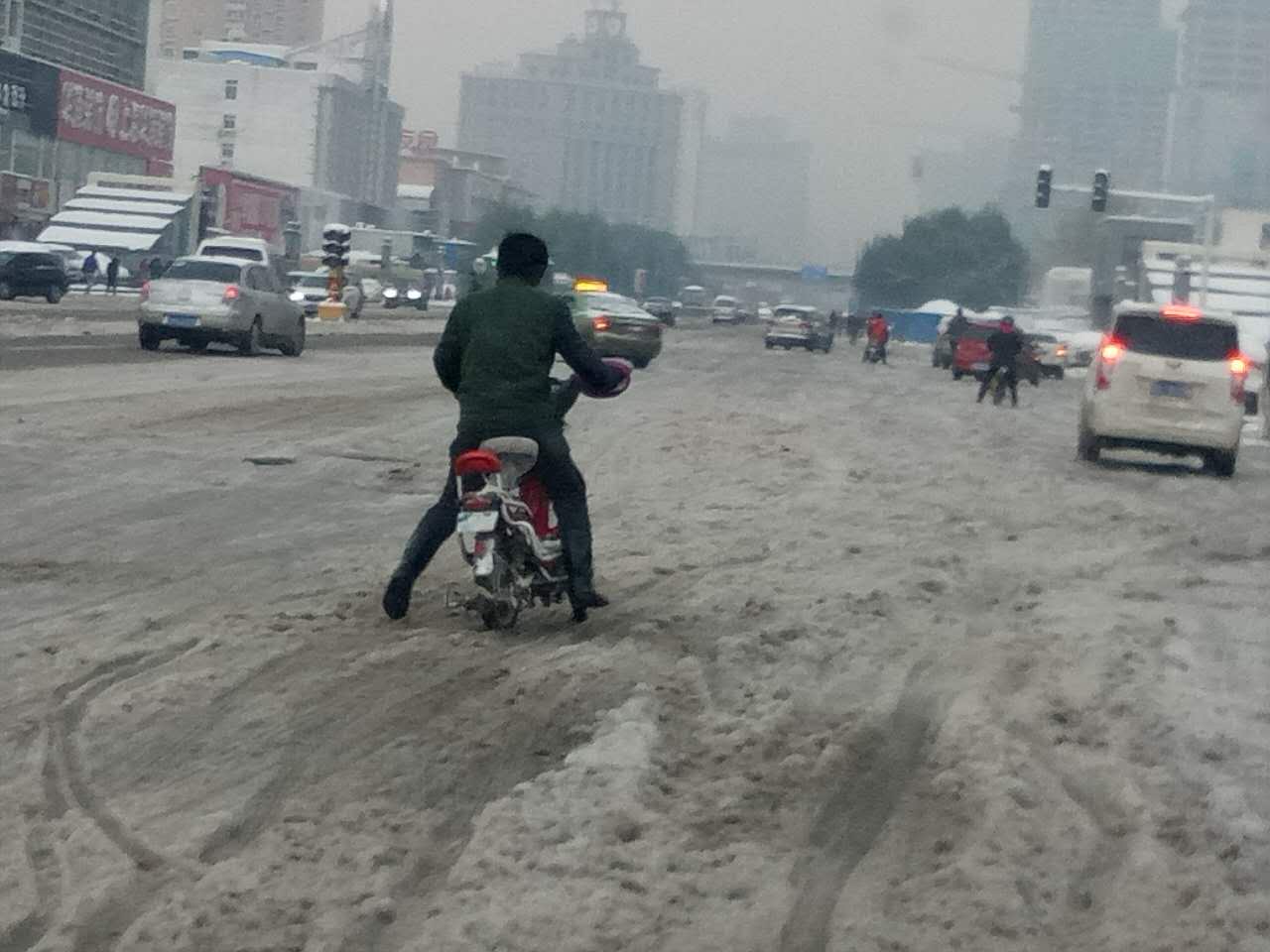 花園路上,市民在積雪中騎車艱難前行!騎電動(dòng)車的市民一定要注意,慢行慢行!剎車時(shí)候穩(wěn)一點(diǎn)慢一點(diǎn)?。ㄠ嵵萃韴?bào))
