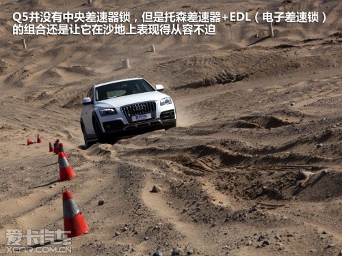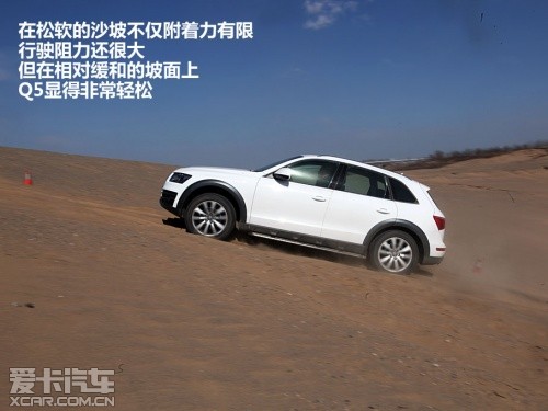 沙坡前半部分的坡度相對要緩一些,而奧迪Q5通過這里的過程自然也是毫不費力。那么在接下來更陡的后半部分當(dāng)中,坡度的增大導(dǎo)致了車速急劇下降,此時松軟的沙子也就成為了車輛繼續(xù)攀爬的絆腳石,恰恰也就在此刻,檢驗quattro四驅(qū)系統(tǒng)真正能耐的時候隨之而來。
