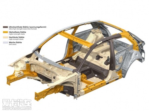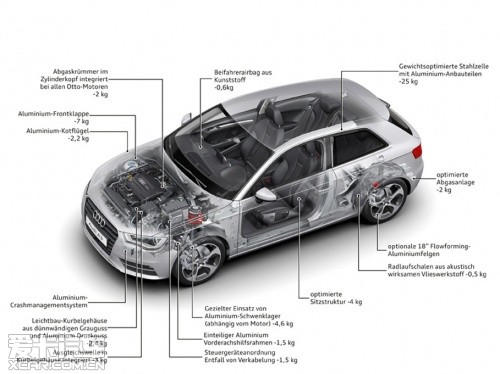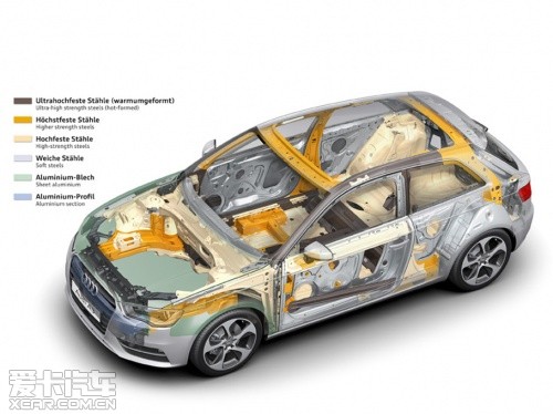 “輕量化”之于奧迪,已然成為品牌精髓所在,截止2011年已有70萬輛裝備了AFS輕質車架的奧迪汽車駛下生產線。全新一代奧迪A3相比老款的減重達到了80千克,首當其沖的就是采用了復合材料車架,車架型材包括了奧迪擁有自主知識產權的:超硬鋼、先進高強度鋼、高強度鋼、低碳鋼以及鋁板。這些不同材料通過多種連接方式構成了強度大幅提升的車身,同時重量下降了18千克。而大眾集團最新的“MQB”橫置發(fā)動機模塊化平臺則能夠幫助奧迪A3進一步減輕重量,比如A3使用的前輪鋁制副車架就帶來了6千克的減重效果。