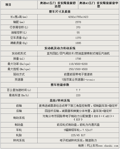 奧迪A3作為奧迪即將引入國內(nèi)的入門級車型,將于下個月正式上市發(fā)布。奧迪A3先期將首推兩款搭載1.8TFSI的五門版車型,分別為奧迪A3五門首發(fā)限量版舒適型和首發(fā)限量版豪華型。通過以下的官方參數(shù)和配置曝光,讓我們提起一睹奧迪A3到底具備怎樣的性能。