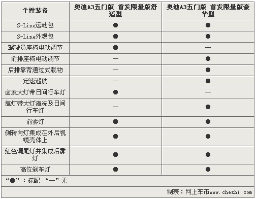 奧迪A3五門首發(fā)限量版舒適型和首發(fā)限量版豪華型基于配置的不同,將決定售價上的差異。奧迪A3五門首發(fā)限量版舒適型作為入門車型,取消了副駕駛座椅電動調(diào)節(jié)、定速巡航以及氙燈帶大燈清洗等配置。